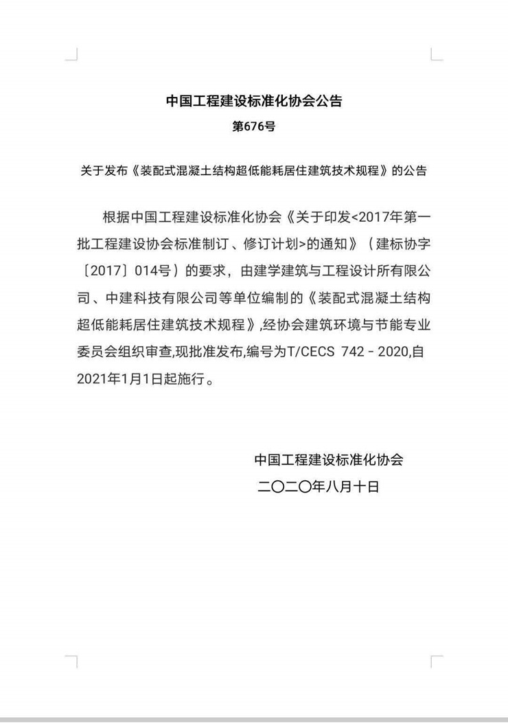 由建學建筑與工程設計所有限公司主編的“裝配式混凝土結構超低能耗居住建筑設計規程”T/CECS-742:2020經中國工程建設標準化協會第676號公告自2021年1月1日起執行。