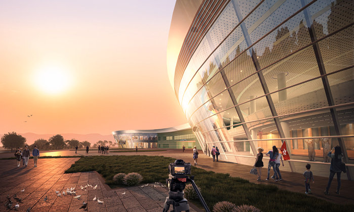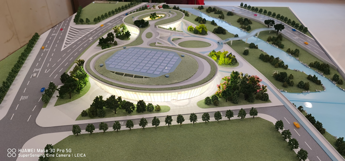 建筑采用山、水、魚、石的概念,在山水中散落,寓意“大珠小珠落玉盤”,承連平自然之華新舊銜接,開連平未來之門;景觀突出“綠色與活力”的主題,以曲線作為構圖元素,豐富植物層次,維護河道生態穩定;可持續設計方面采用零碳排、零水耗、零感知的設計理念和綠島取代熱島的綠色設計措施應用,項目將成為廣東省首個超低能耗文體中心。