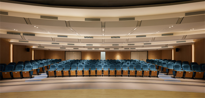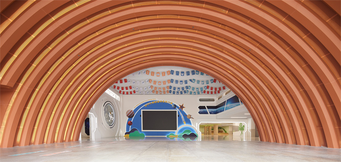 主入口的設計借鑒傳統客家建筑入口形式以及廣東嶺南園林的造園手法,采用圓拱型設計,通過與建筑外立面的方與圓的對比強調入口形象,增強進入校園的儀式感。入口室內裝飾設計采用時光隧道的概念,體現學生由家進入校園后氛圍和心情的轉變的過程隧道,學生通過光暈的隧道,調節內部心理,通過隧道后進入學習的海洋。利用時光隧道明顯的分隔校內校外空間,讓學生感覺到進入另外一個世界,增強學生的學習興趣。