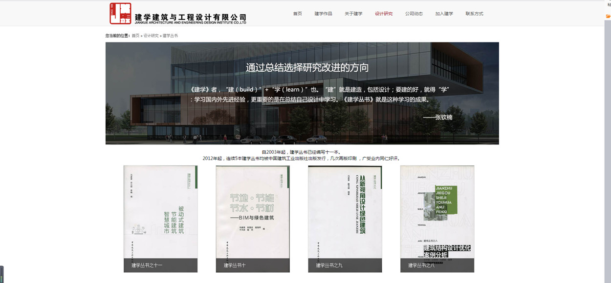 內容上,我們在公司網站首頁及各個頁面,選取了近幾年可以代表建學的項目作品,更新了公司簡介、公司執照、獲獎情況,對加入我們欄目進行了修改,從培訓、出國考察、工會活動、工作環境四個方面進行了介紹。新增了建學學術欄目,其中對建學叢書、綠色建筑、裝配式建筑、被動式建筑、物流專項等建學特色進行了介紹,上傳了一些都代表性的文章,展示了建學在這幾個方面的建樹。在項目展示中,我們根據自身特點,增加了被動式建筑、裝配式建筑、特色小鎮、電鍍廠項目等。 下圖為公司簡介效果圖