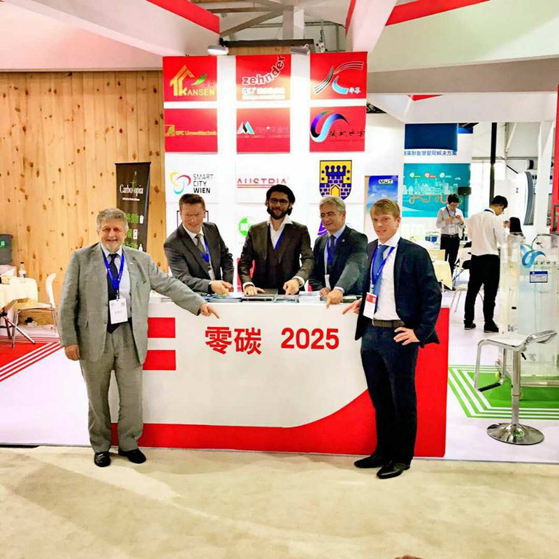 本次大會場館坐落在美麗的西津渡,共2.1萬平方米,國內外265家企業參加了本次展出。建學合作伙伴歐中環境協會及中安和平控股有限公司主辦了奧地利館的展出,館內集成了堪森裝配式被動式木屋、駿馳污水處理、森德新風、MUT垃圾處理、古興生物質汽化、瑞好門窗、河北新華幕墻廠門窗等多項國內外先進技術。三天的展出奧地利館成為了參觀人數最多的展館,來賓對奧地利館提供的低碳技術產生了濃厚的興趣。