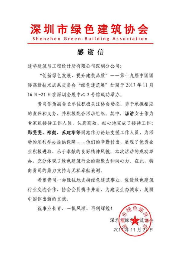 此外,在高交會期間,作為深圳市綠色建筑協會的副會長單位,建學深圳分公司也派出多名工作人員協助與配合協會工作,認真高效的完成服務工作。活動結束后,深圳市綠色建筑協會發來感謝信,對我司的鼎力支持與無私奉獻表示衷心的感謝。