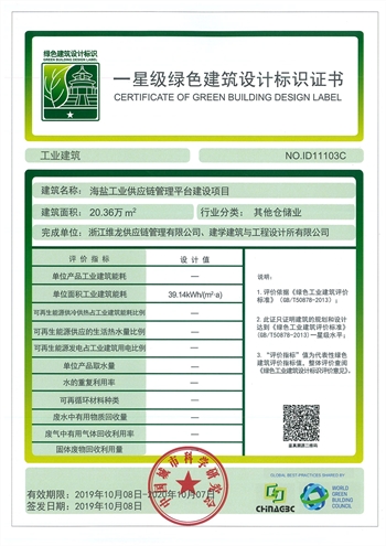 海鹽工業供應鏈管理平臺建設項目獲得一星級綠色建筑設計標識 |