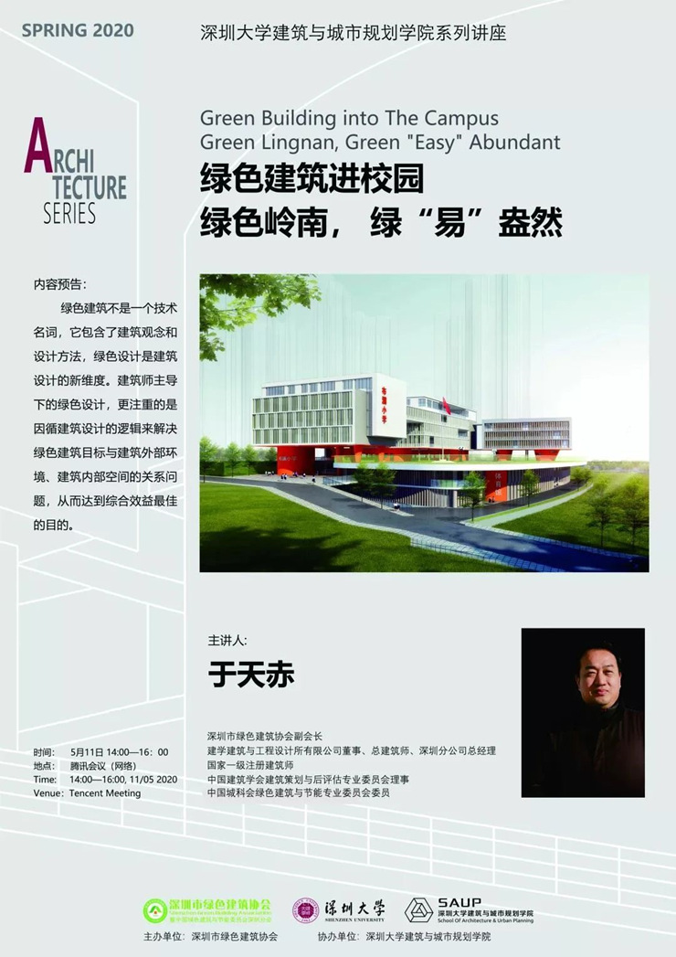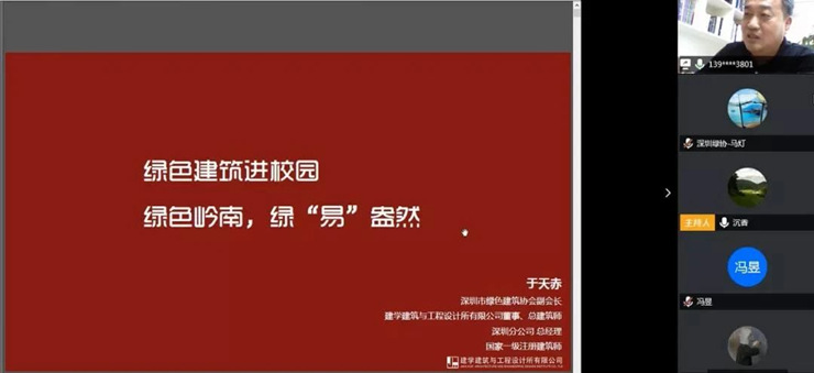 近日,由深圳市綠色建筑協(xié)會(huì)主辦、深圳大學(xué)建筑與城市規(guī)劃學(xué)院協(xié)辦的“綠色建筑進(jìn)校園——綠色嶺南,綠‘易’盎然”線上講座成功舉辦。此次講座由深圳市綠色建筑協(xié)會(huì)副會(huì)長(zhǎng)、建學(xué)建筑與工程設(shè)計(jì)所有限公司董事、總建筑師、深圳分公司總經(jīng)理于天赤主講,來(lái)自深圳大學(xué)的青年學(xué)生及有關(guān)行業(yè)技術(shù)人員共180余人參加。