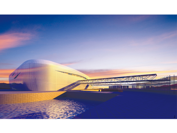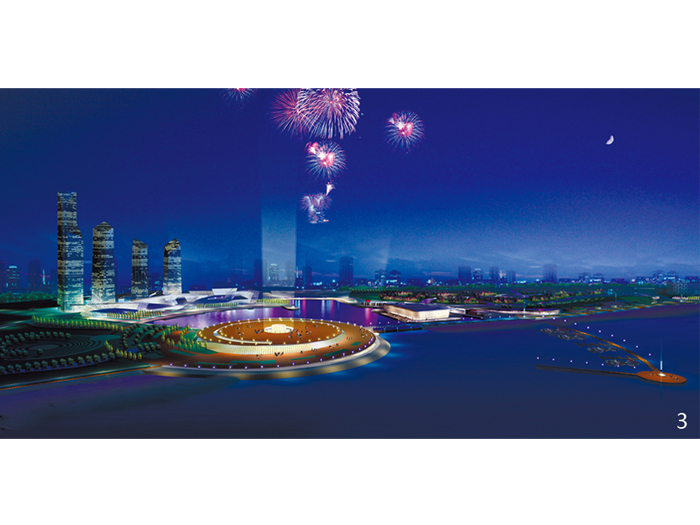 中心以核心商務區,城市陽臺及演藝廣場為主。城市文化城市形象的特色區,核心商務區建筑面積近30萬平米,它需要一定的商業配套設施,同時也要求一定尺度的觀賞空間。政府前廣場、城市陽臺、演藝廣場是“海洋文化軸”上的系列空間,它需要滿足人群集會、演藝的需要,要有寬闊的空間。