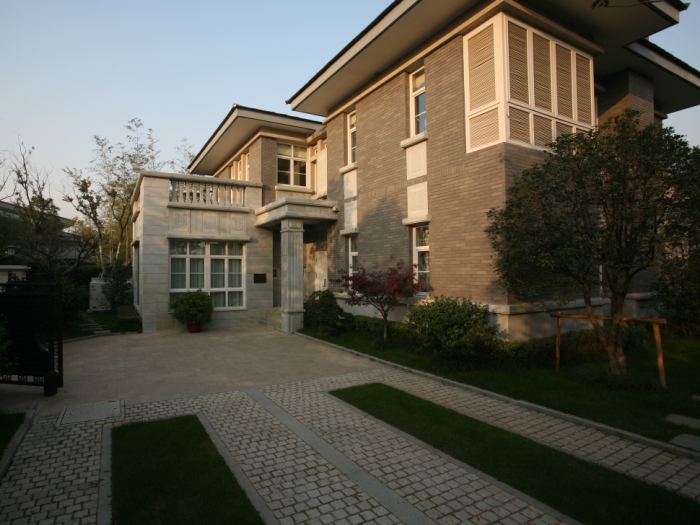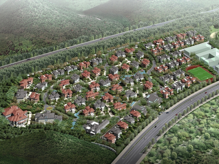 鐘山美廬利用周邊及場地內的景觀資源,依山而居,規劃為坡地山莊。以組團式布局作為組織方式,通過環形主路將各組團串聯,構成一個有機整體,形成由小區內干道半私密半公共的組團綠地,各戶私家宅院的有序的空間層次,使建筑與環境融為一體,寓建筑于風景中。在用地的北部沿金馬路設置小區入口,通過濃密森林景觀氛圍,強調入口山地別墅的意向,入口兩側為會所,使別墅主人體驗非同一般的儀式感與尊貴感。用地中部由四條溪流蜿蜒其間,讓山體的泉水和綠色沿小溪流入別墅社區,成為塑造小區景觀的四條軸線,同時也將環形主路內的用地自然劃分為五個相對獨立又親水的半島組團;用地東側緊鄰小龍山部分則布置大戶型別墅,充分享受山體景觀;南側面是小龍山蜿蜒的余脈,與小龍山一起如一把交椅坐擁小區;用地西北側布置為雙拼,收攏小區邊界,使整個區域藏風聚氣。